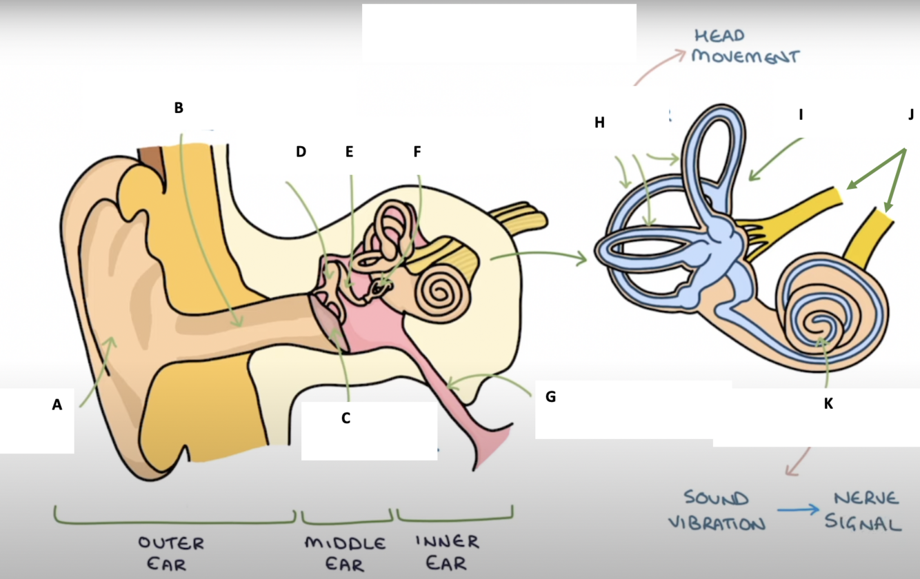 Name A - K on the below diagram of the ear anatomy: