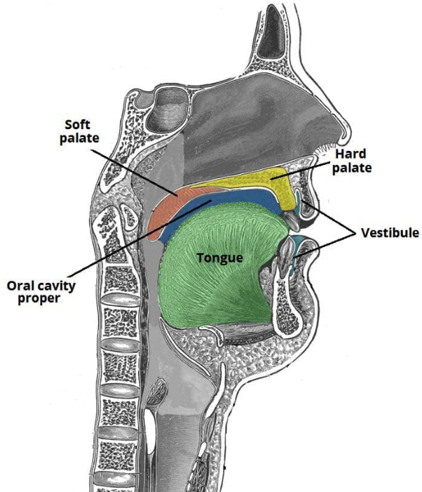 Vestibule anteriorly - between lips/cheeks and teeth/gums