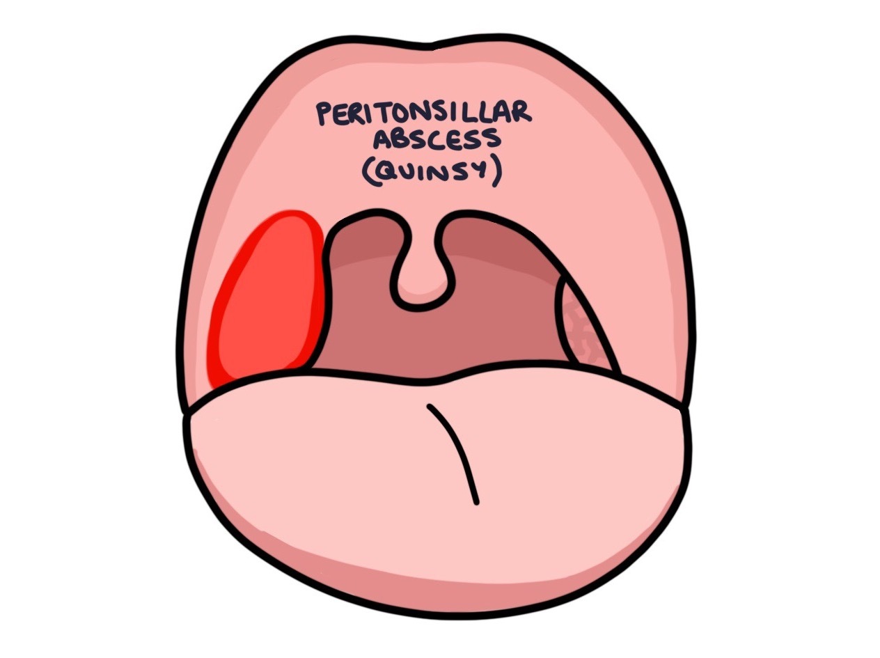 Bacterial infection with trapped pus, forming an abscess in the region of the tonsills.