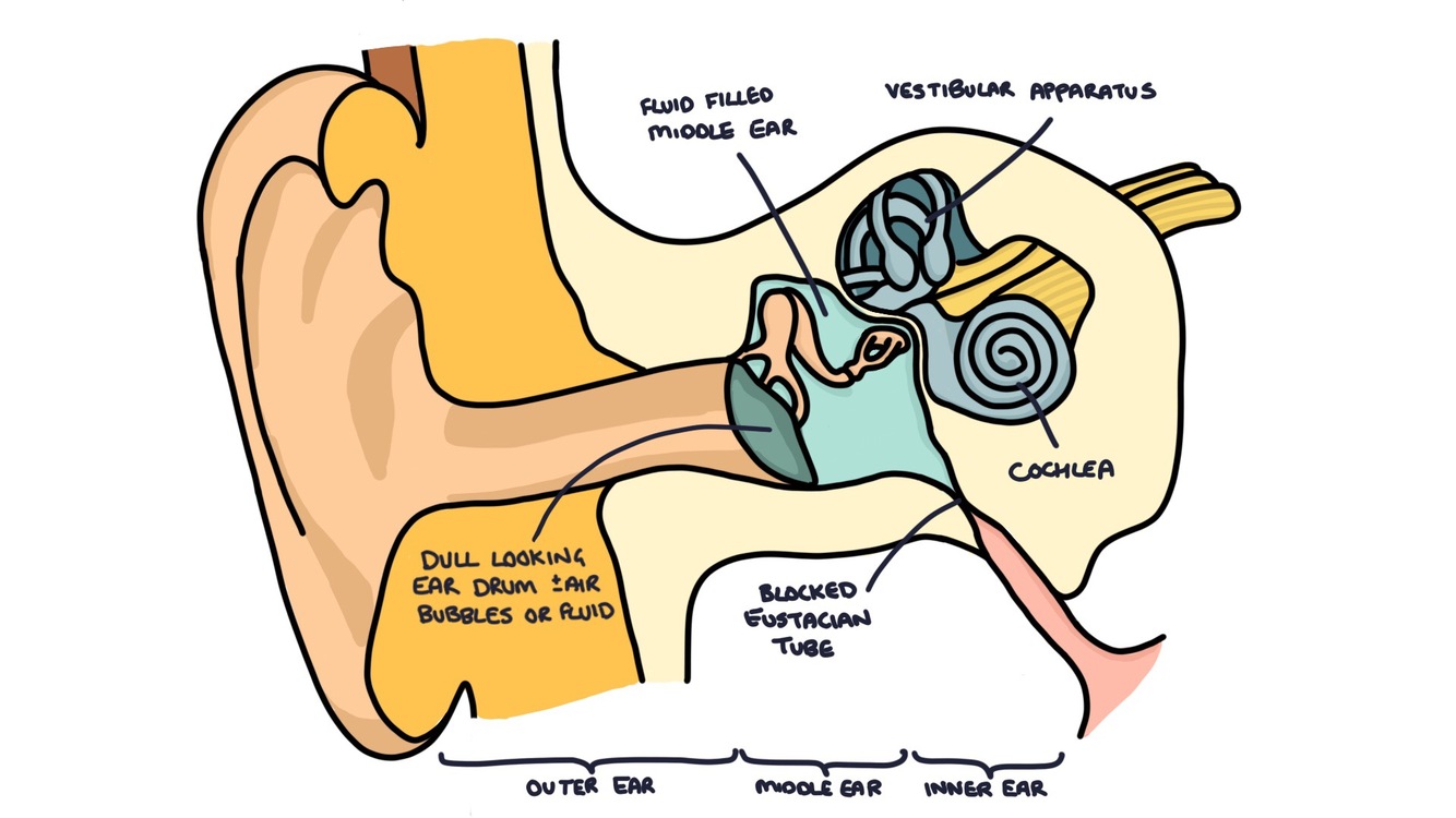 Blockage of the eustachian tube causes middle ear secretions to accumulate in the middle ear space.