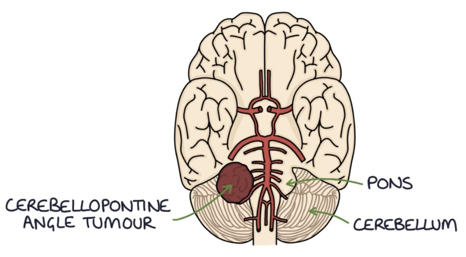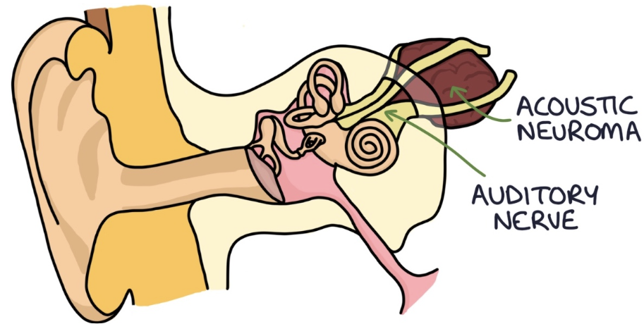 Benign tumours of the Schwann cells (provides myelin sheath around neurones) surrounding the auditory nerve (CN VIII) that innvervates the inner ear