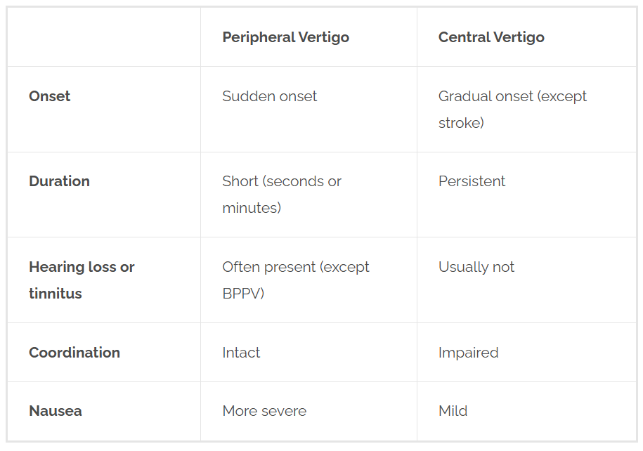 Vertigo = episodes of 20 mins to several hours, clusters then prolonged periods with no vertigo