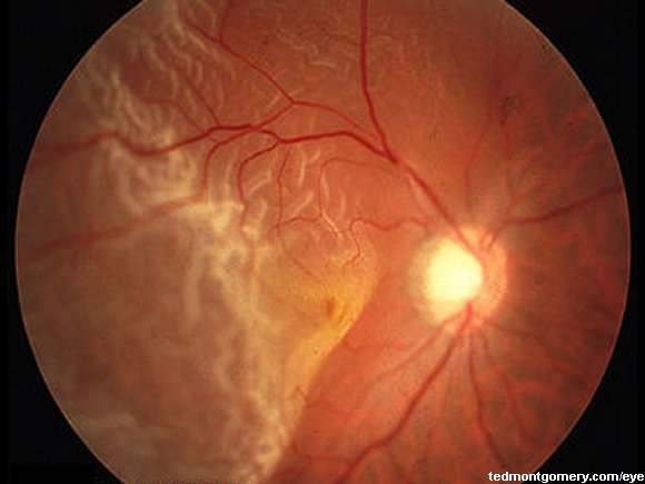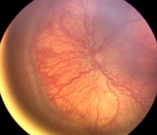 Retinopathy of prematurity. There is a broad thick ridge separating the avascular retina from the vascular retina