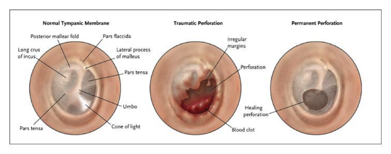 Keep the ear dry. Refer to ENT for follow up if traumatic/dizziness/not healing in 2 weeks
