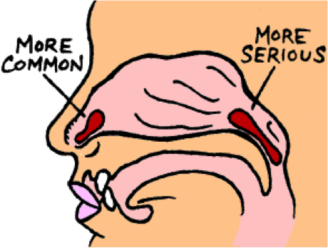 Two types of nosebleeds (epistaxis) and which is most common, most serious?