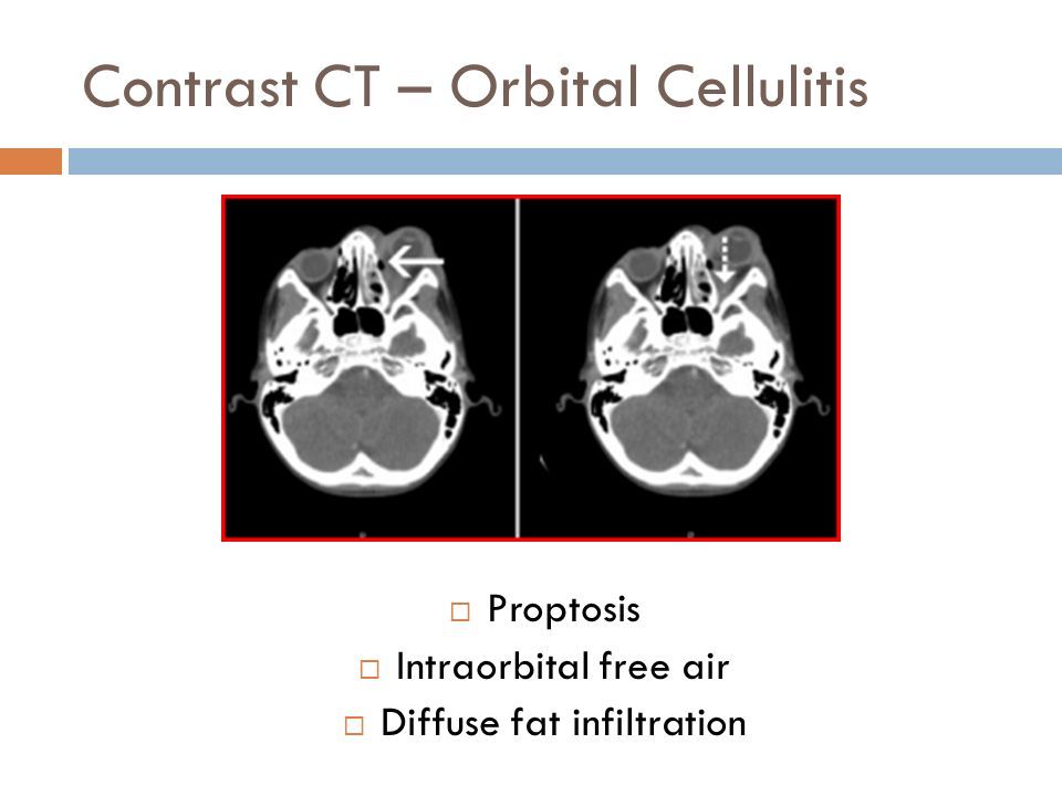 Dx: High resolution CT Scan (infection of the fat & ocular muscles). MRI