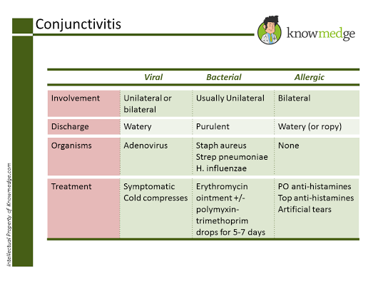 conjunctival erythema (red eyes) and may have other allergic Sx (rhinorrhea)