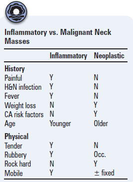 Describe the difference between inflammatory vs malignant neck masses?