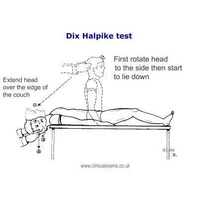 There, the patient’s head is twisted and then rapidly brought down onto a pillow - watch the patients eyes for nystagmus (upbeat, torsional) and ask for symptoms of vertigo.