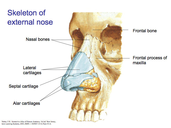 Nasal bones forming the bridge of the nose, articulating with frontal bone above and frontal process of maxilla laterally. Lateral, septal and alar cartilages form the rest of the anterior projection.