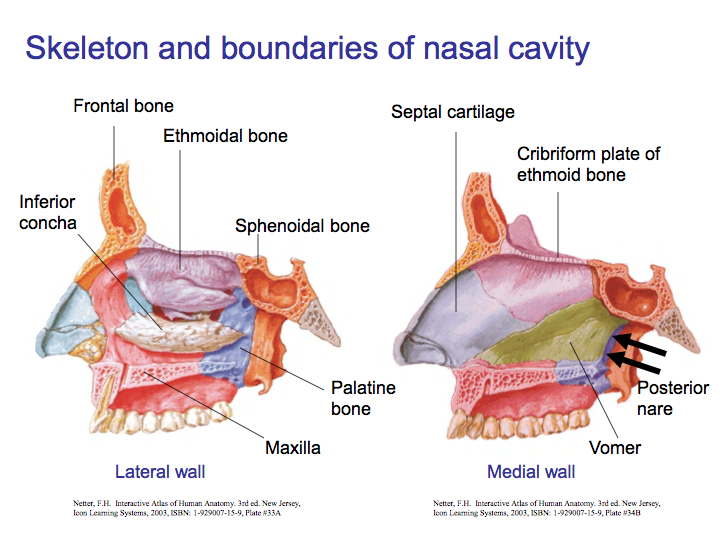 One horizontal plate in anterior cranial fossa by cribriform plate and downwards projections making the medial wall/septum and two lateral walls.