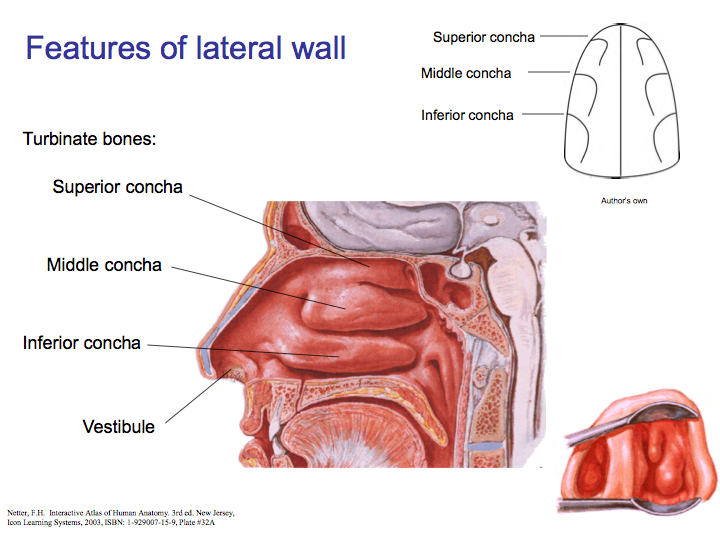 Turbinate bones projecting off the lateral nasal wall into the nasal cavity - superior, middle and inferior.