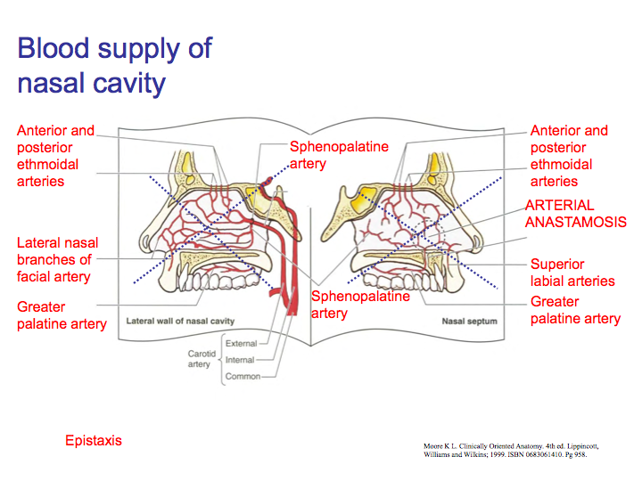 Branches of greater palatine arteries that come in through the mouth and into the nose through a hole in the floor of the nasal cavity.