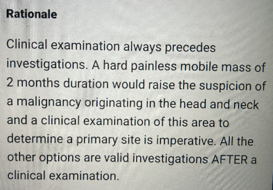 What is the most important initial investigation of a patient with a two-month history of a hard painless mobile 2cm mass in the left mid neck?
