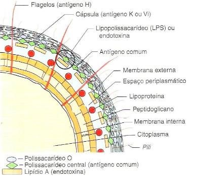 O antígeno O caracteriza a cepa, o cerne de polissacarídeos caracteriza o gênero e o lipídeo A é o fator principal de virulência. V ou F