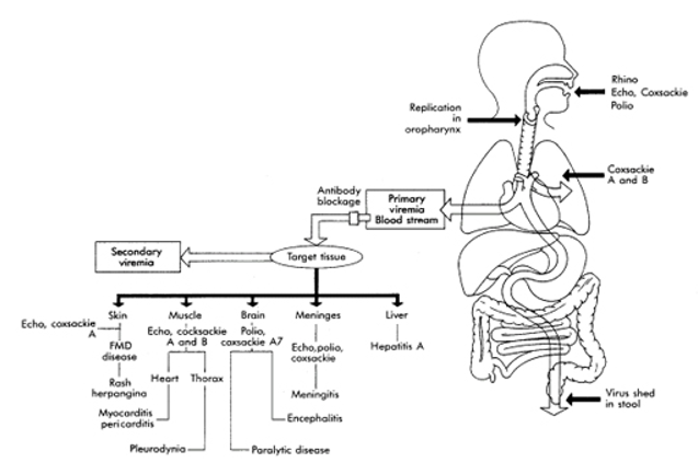 Enteroviruses are ingested or inhaled >> enter and replicate in oropharynx >> intestines >> regional lymph nodes >> blood stream (cause primary viremia – illness ends here if pt has immunity) >> sustained viremia (virus targets tissues) >> can disseminate to liver, brain, meninges, skin, muscle etc