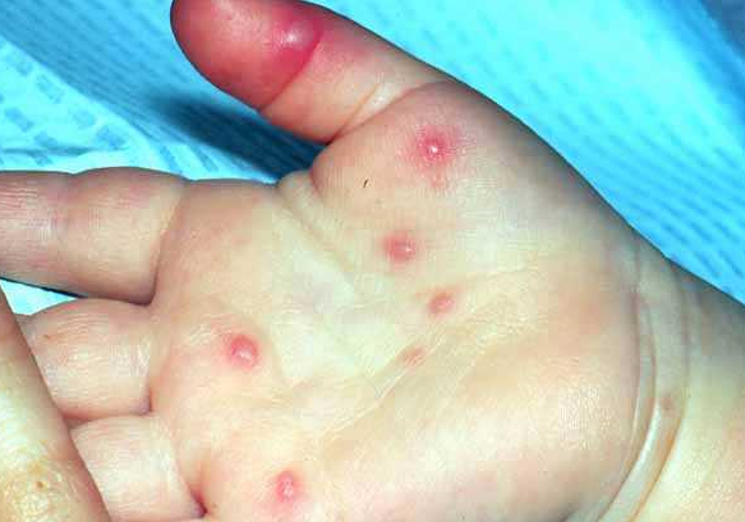 Hand-foot-mouth disease: vesicular stomatitis; vesicles or papules on hands, feet, groin