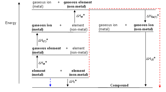 The enthalpy change when 1 mole of a solid ionic compound is formed from its gaseous ions under standard conditions (298K, 101KPa, 1 mold dm-3). Its a measure of ionic bond strength.