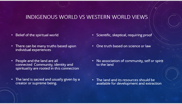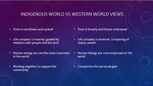 “Culturally responsive curriculum and pedagogy”; acknowledging the invisibility of Indigenous Peoples and their knowledge within an institutional framework; recognizing and valuing Indigenous worldviews, culture– their way of knowing, being, doing; the sharing of Indigenous knowledge, stories, perspectives in the education system