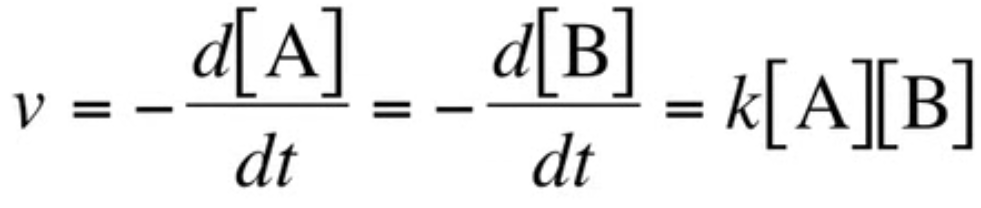 Rate of the decrease of [A] or [B] over time (equivalent because of the stoichiometry of the reaction, 1 A with 1 B). Directly proportional to amount of reactant, rate constant ( k ) is second-order because velocity depends on two reactants