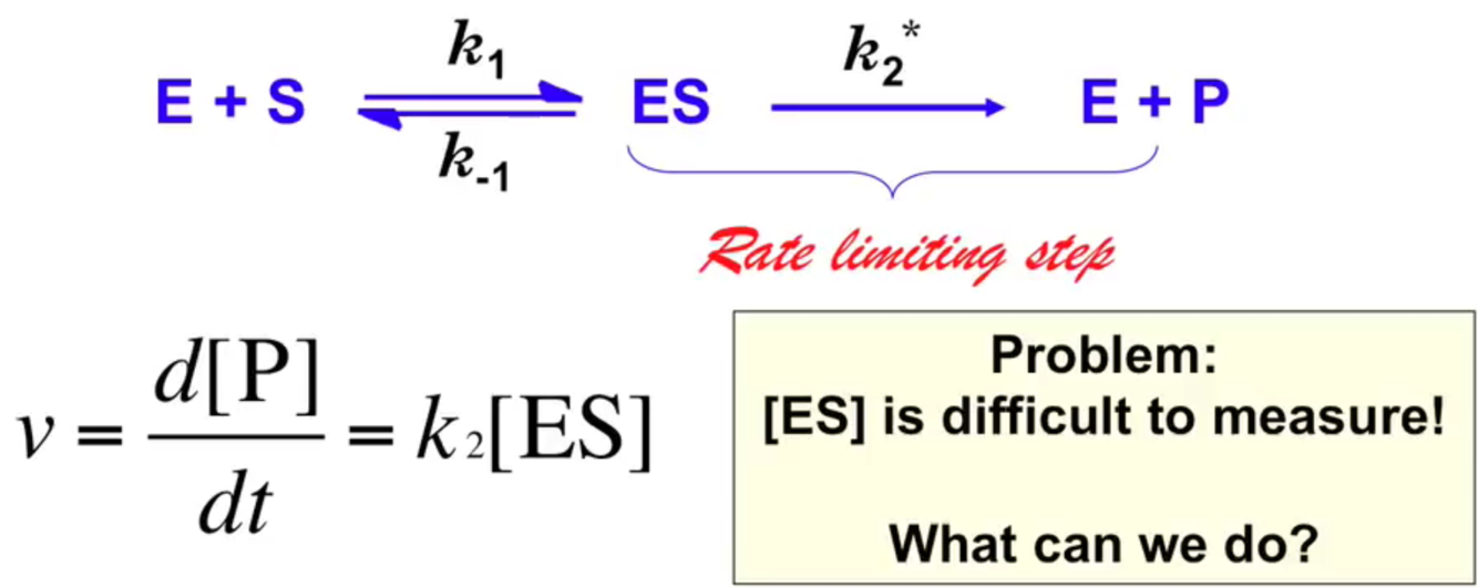 We can measure total amount of substrate [E]t, but [ES] concentration is difficult to measure in the lab, so determining d[P]/dt = k2[ES] for the reaction E + S ⇌ ES ⟶ E + P is not possible. Because we assume that k2 is irreversible, we can measure [ES] indirectly from the formation of ES ( rate1 = k1 [E][S] ) less the depletion of ES ( rate-1 = k-1 [ES] and rate2 = k2 [ES] ).