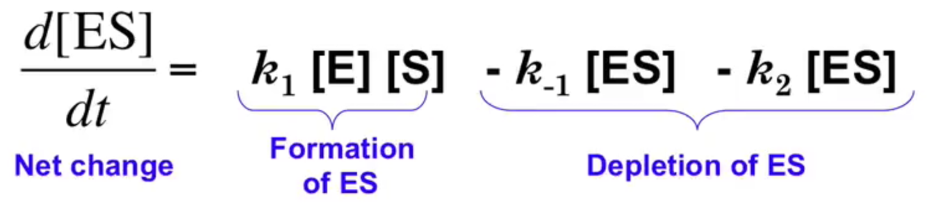 meaning that ES concentration does not change. Because the concentration of ES does not change over time due to the steady-state assumption, k1 [E][S] - k-1[ES] - k2[ES] = 0.