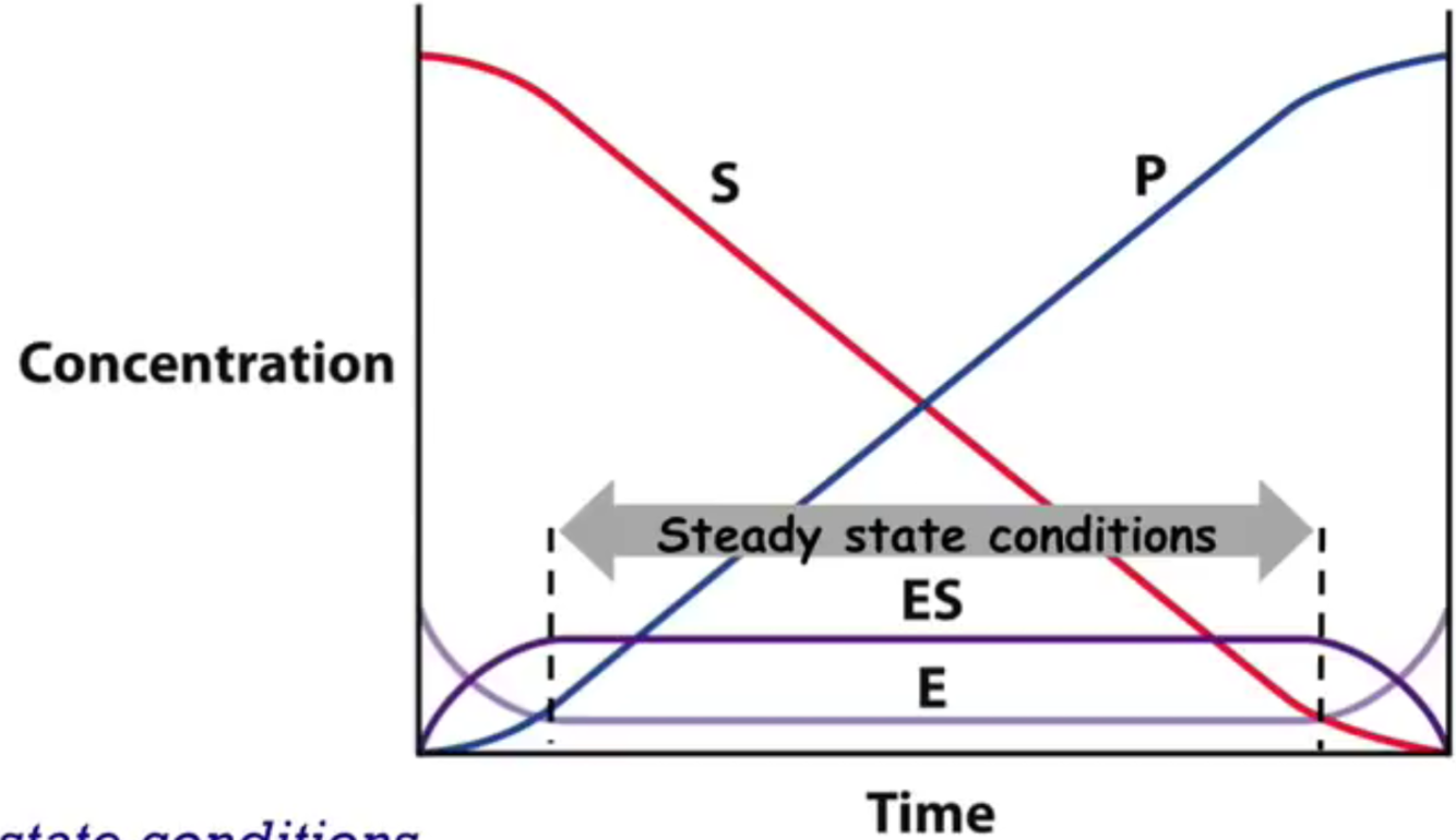 Steady-state conditions are those in which the enzyme is saturated with substrate, so that once ES ⟶ E + P, the free enzyme is immediately re-bound to substrate reforming the ES complex. There is essentially no free enzyme in solution, so