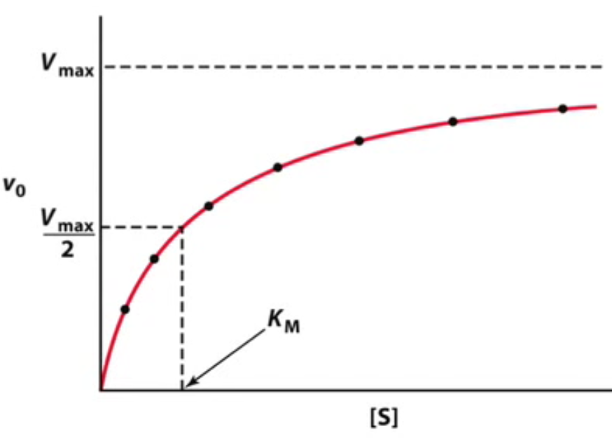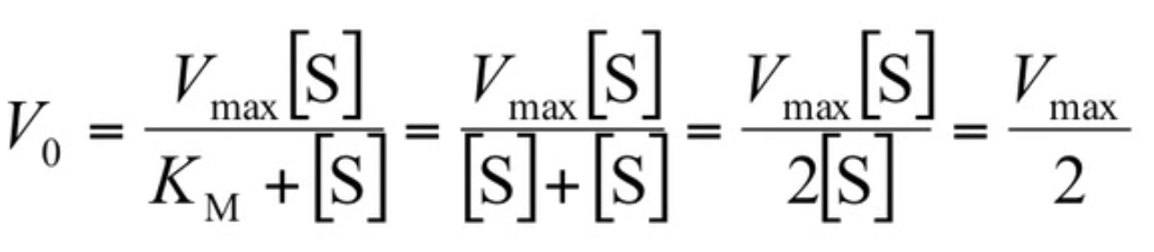 When substrate concentration is equal to the Michaleis-Menten ES dissociation equilibrium ( [S] = KM ), velocity of the reaction is half-maximal ( 1/2 Vmax )