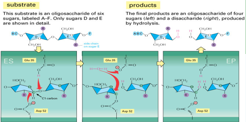 Which two amino acids are involved in breaking the glycosidic bond between sugar D and sugar E in a Lysozome catalytic reaction?