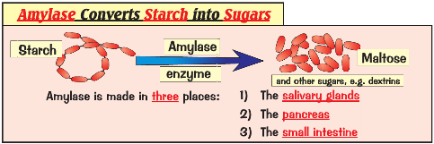 Amylase is produced and is found in the saliva.