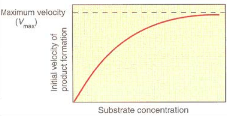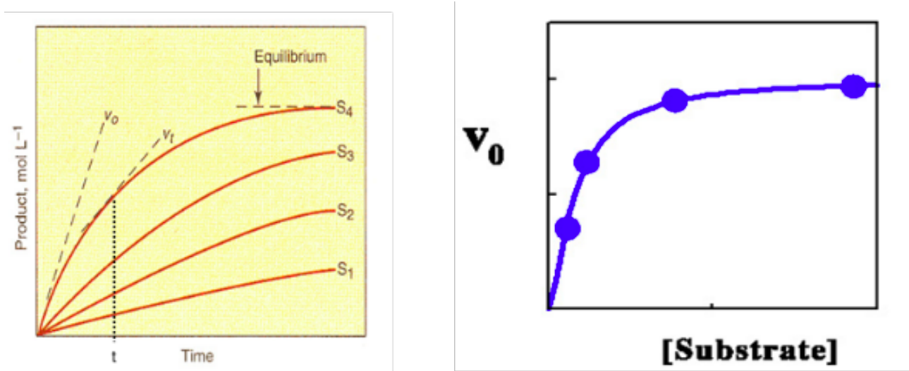note: Reaction rate decreases (curves on the graph) once the enzyme depletes the substrate pool