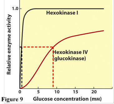 Hexokinase I has a much lower Km for glucose –> high affinity for glucose –> readily saturated with glucose to phosphorylate it.