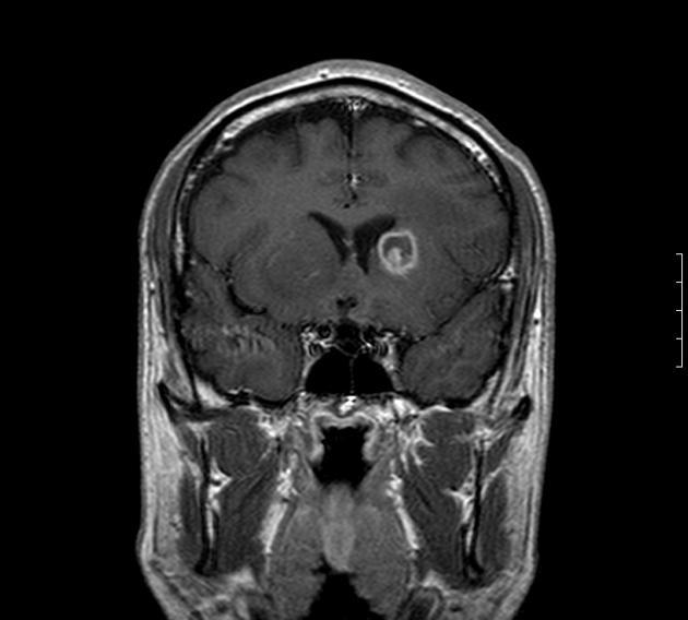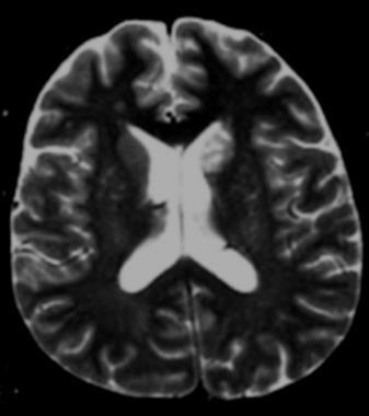 Axial T2-weight MRI shows clustered hyperintensities in the left caudate; these are consistent with enlarged Virchow-Robin spaces caused by small cryptococcomas