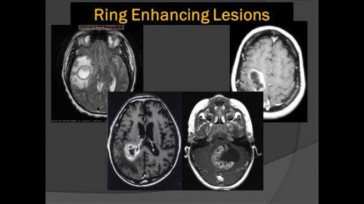 Toxoplasmosis is commonly noted in HIV-positive patients and presents with multiple ring-enhancing lesions. Sulfadiazene is a sulfa Abx and pyrimethamine is an anti-parasite.