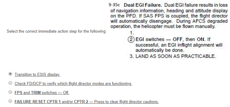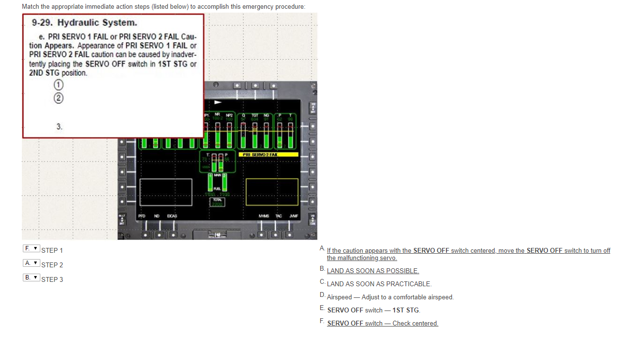 PRI SERVO 1 FAIL or PRI SERVO 2 FAIL caution appears. Appearance of PRI SERVO 1 FAIL or PRI SERVO 2 FAIL caution can be caused by inadvertently placing the SERVO OFF switch in 1ST STG or 2ND STG position. What is the EP?