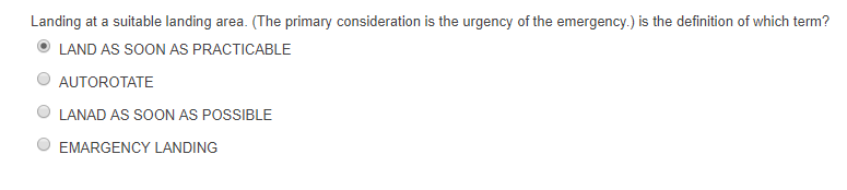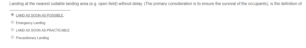 Landing at the nearest suitable landing area (e.g. open field) without delay. (The primary consideration is to ensure the survival of the occupants), is the definition of…