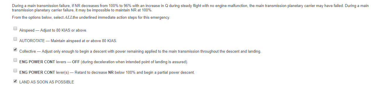 During a main transmission failure, if NR decreases from 100% to 96% with an increase in Q during steady flight with no engine malfunction, the main transmission planetary carrier may have failed. During a main transmission planetary carrier failure, it may be impossible to maintain NR at 100%.