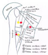 Entre le processus coracoïde et l’acromion de la scapula
