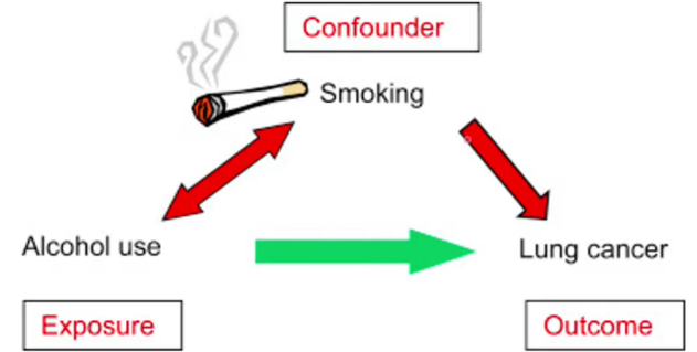 Ge exempel på hur rökning kan vara en confounder i förhållande till exponeringen alkohol och utfallet lungcancer