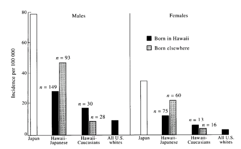 stomach cancer was the 1st type of cancer in Japan - high incidence in Japan and low in US - this was the opposite for colon cancer