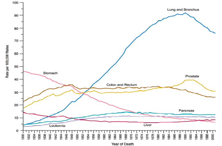 increase in lung cancer from 40s - 20yrs after the increase in smoking