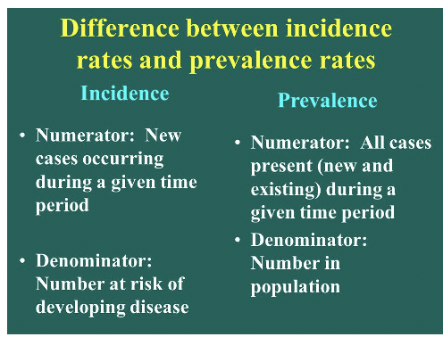 Incidence is the rate at which people contract a disease in the population. It counts the number of new cases over a given period of time, and divides it by the number of people who were at risk of contracting the disease over that time period. It is usually expressed as n cases per N population per t time.