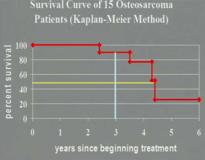 An example is the participant who joined later on did not only live 0.7 years, he was only in the study for 0.7 years. The mean survival value will actually give a lower number than the reality. Median only works if the lower half of your population are not censored patients, otherwise you don’t know who lived longer and thus don’t know where to order them to determine a median.