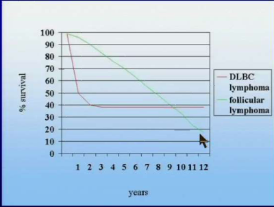 DLBC lymphoma has rapidly decreasing survival until about 2 years, then you’re good to go. Follicular lymphoma survival slowly, but steadily decreases over the years.