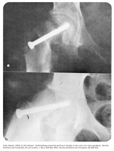 · Parafuso único entrando perpendicular à fise, em direção ao centro da cabeça femoral e 4 roscas cruzando a fise