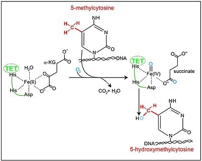 TETs utilize iron as a cofactor. They use molecular oxygen to catalyse oxidative decarboxylation of alpha-ketoglutarate, generating a reactive high-valent, enzyme-bound Fe(IV)-oxo intermediate, which then reacts with 5mC to create 5hmC.