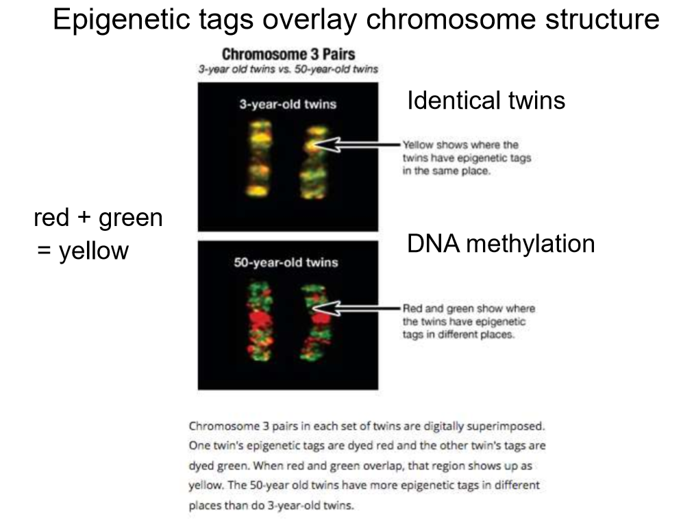 -DNA methylation pattern start to diverge significantly over time (50 year old twins have more epigenetic tags in different places than 3 year old twins do), due to being in different environments over time