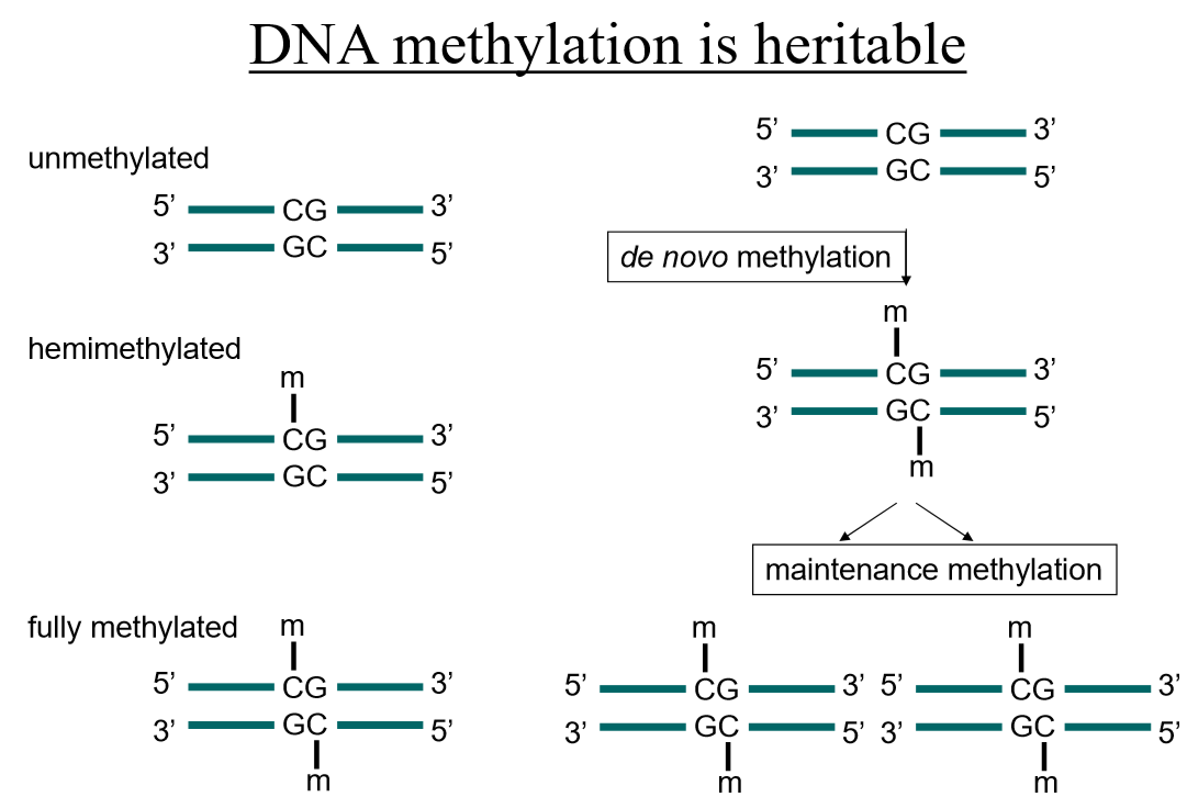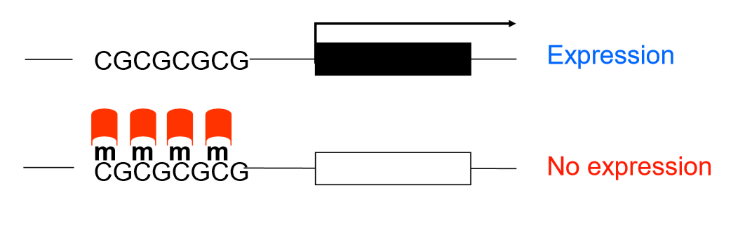 Heritable modifications of DNA that do not alter the primary sequence (e.g. me-C at CpG), but result in altered gene expression (e.g. gene silencing).