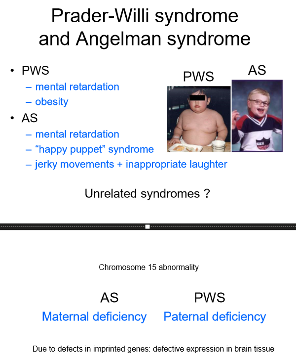– Underlying cause: Inheritance of two maternal chromosomes 15 (paternal deficiency) or deletion of segment containing active Prader-Wili gene and imprinted Angelman gene.