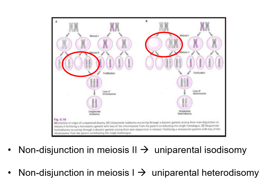 * Uniparental disomy = Inheritence of two chromosomes from either the father or mother (rather than one from each)